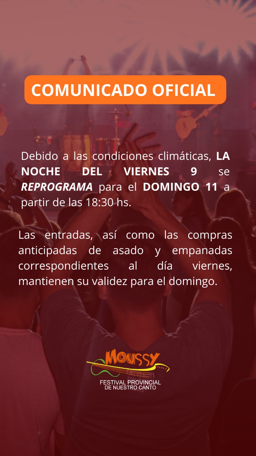 Las entradas, así como las compras anticipados de asado y empanadas correspondientes al dia viernes mantienen su validez para el domingo .