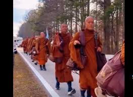 Monjes budistas caminan cientos de kilómetros, mientras miles de personas los siguen por las redes sociales