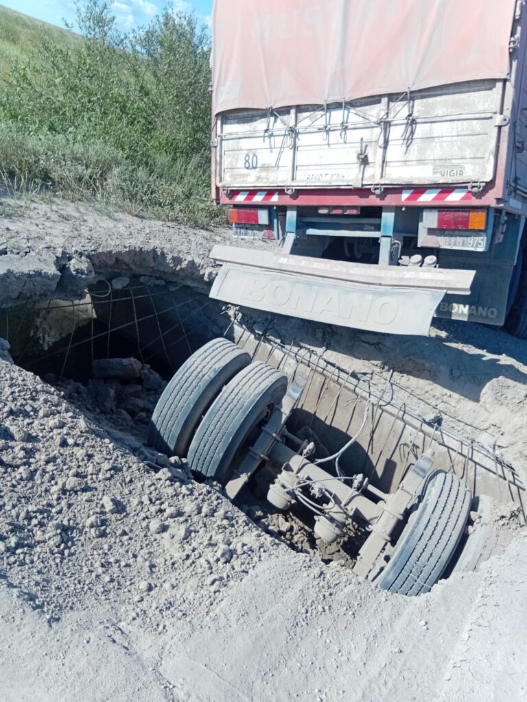 El vehículo circulaba en sentido Este-Oeste sobre la calzada natural cuando la estructura colapsó repentinamente. Como consecuencia del socavón, el sistema de ejes y ruedas del acoplado se desprendió, dejando a la unidad completamente inmovilizada y con severos daños materiales. Afortunadamente, el chofer resultó ileso.
